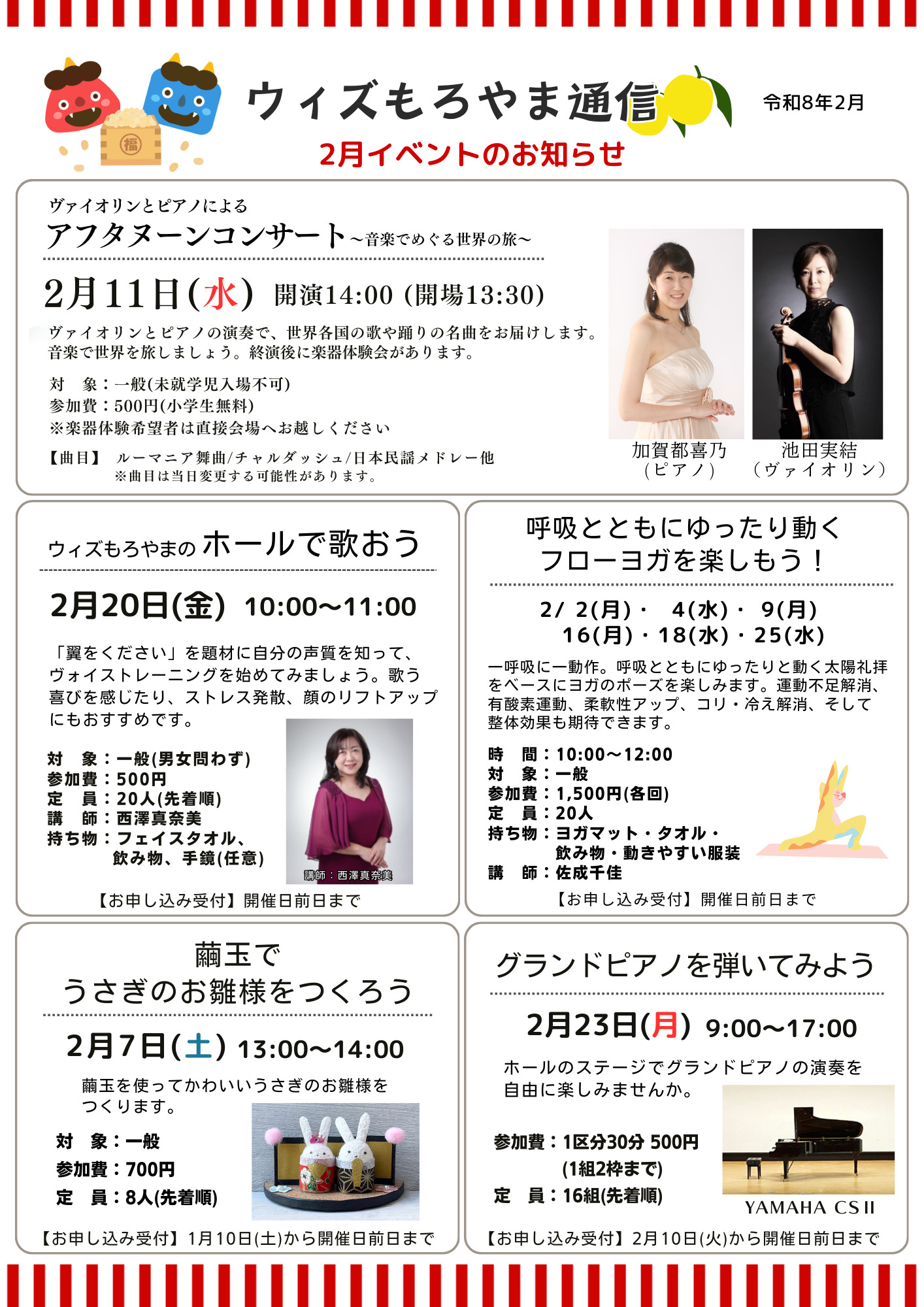 2026.01.17ニュース『ウィズもろやま通信2月号』を発行しました『ウィズもろやま通信2月号』 イベント情報などを掲載した『ウィズもろやま通信』を毎月発行します。 館内に配架しますので、ぜひお手に取ってご覧ください。 イベントのお申し込みやお問合せはお気軽にスタッフまでお声かけください。