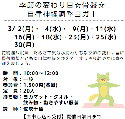 令和8年3月2日(月)・4日(水)・9日(月)・11日(水)・16日(月)・18日(水 )・23日(月)・25日(水)・30日(月) ヨガ講座『季節の変わり目☆骨盤☆自律神経調整ヨガ!』開催します🧘