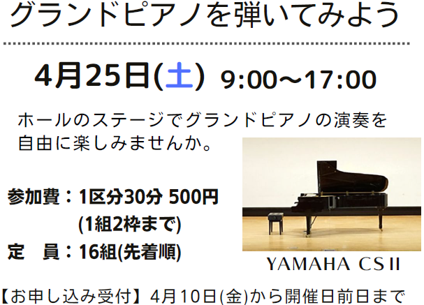トップページ > お知らせ > イベント > 4月25日(土)『グランドピアノを弾いてみよう♪』開催します