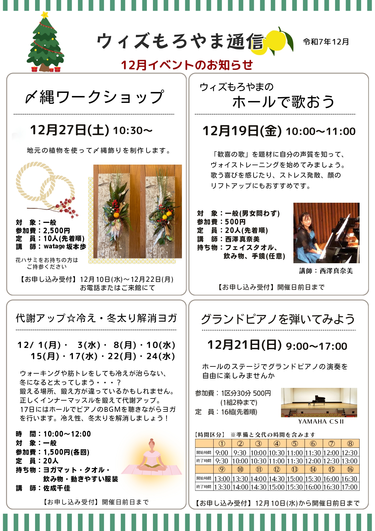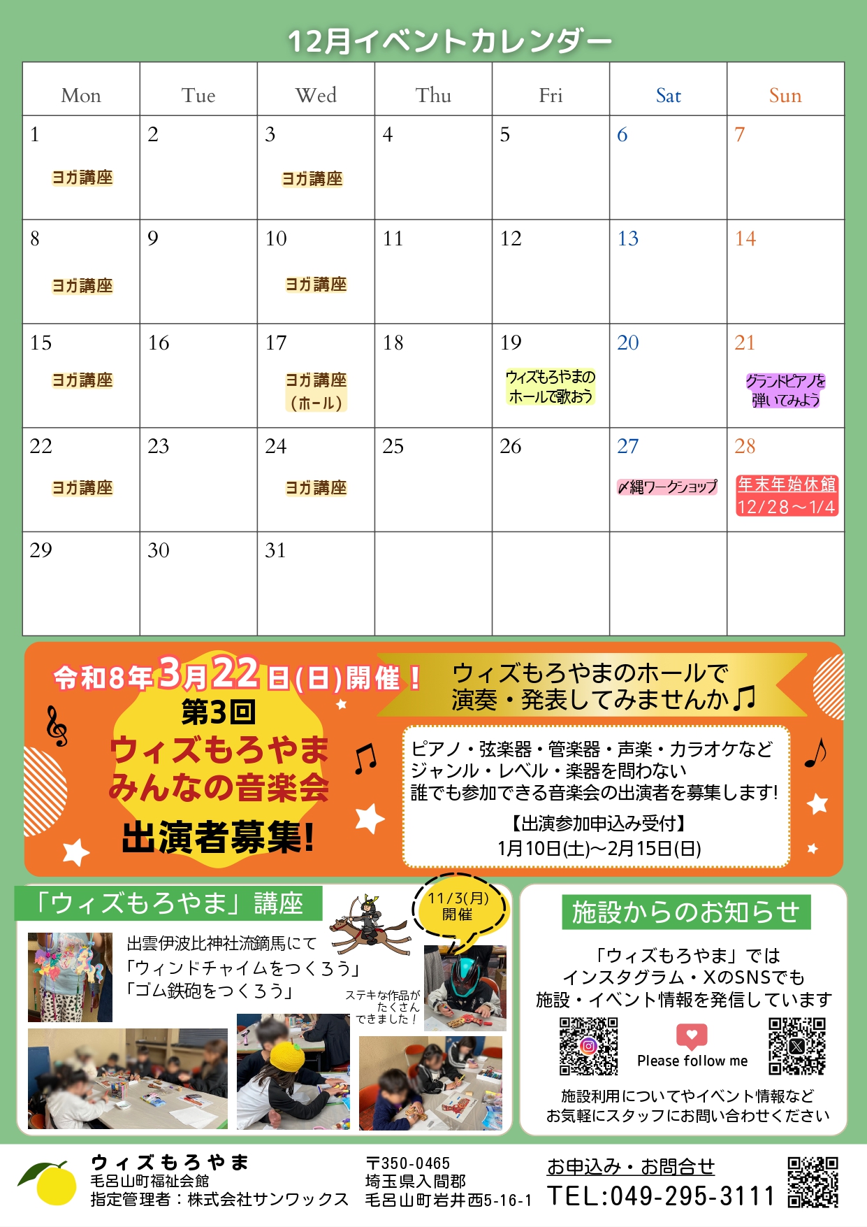 2025.11.27ニュース『ウィズもろやま通信12月号』を発行しました『ウィズもろやま通信12月号』 イベント情報などを掲載した『ウィズもろやま通信』を毎月発行します。 館内に配架しますので、ぜひお手に取ってご覧ください。 イベントのお申し込みやお問合せはお気軽にスタッフまでお声かけください。